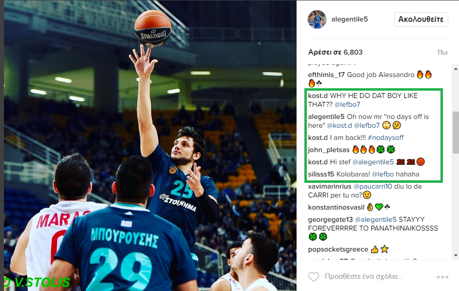 Μετά απο μια καλή εμφάνιση του Ιταλού, ο ίδιος βρήκε μια φωτογραφία του που του θύμισε τον Στεφ Κάρι και το έγραψε αστειευόμενος στην λεζάντα, “επισημαίνονται” και τον Μποχωρίδη με τον Χαραλαμπόπουλο. Όπως καταλαβαίνετε ακολούθησε γλέντι στα σχόλια με τον Χαραλαμπόπουλο να αποκαλεί “Στεφ” τον Τζεντίλε και τον Μποχωρίδη να συνεχίζει.Έπειτα στο παιχνίδι μπήκε κι ένας άλλος νεαρός παίκτη του Παναθηναϊκού, ο Κώστας Γόντικας. Το σχόλιο που μας έκανε πειρiσσότερο εντύπωση ήταν αυτό του Μαρκίζ Χέινς, του πρώην “πράσινου” γκαρντ, ο οποίος έσπευσε να κάνει κοπλιμέντο στον Ιταλό.
