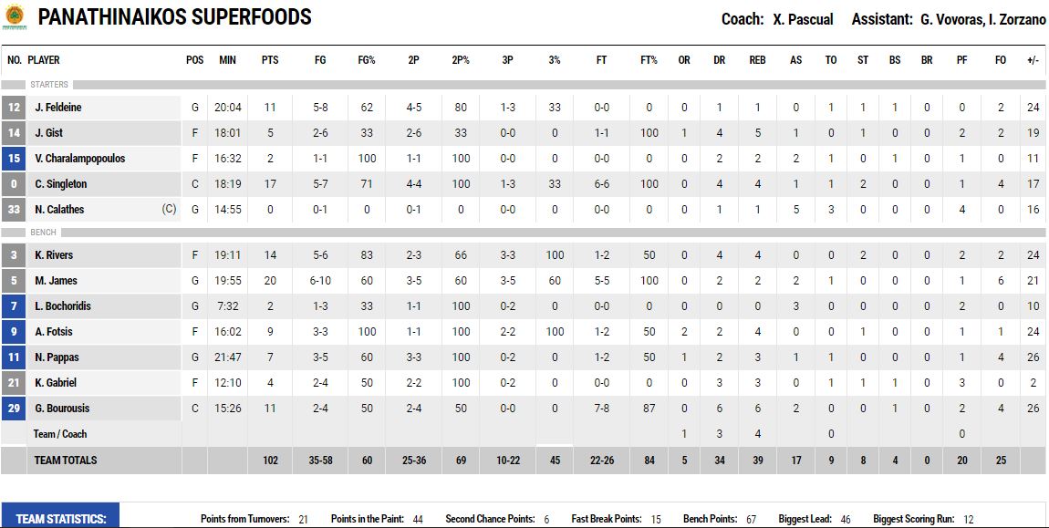 Οι Τζέιμς, Σίνγκλετον και Ρίβερς δεν είχαν αντίπαλο κάτω από τα καλάθια, μιας και είχαν 20, 19 και 14 πόντους αντίστοιχα, ενώ ακολούθησε ο Φελντέιν με 11 πόντους αντίστοιχα και μάλιστα ο άλλοτε παίκτης της Μπασκόνια έβαλε το αναμέτρηση με 11π, ενώ κοντά σε διψήφιο ήταν και ο Φώτσης με 9π.