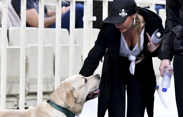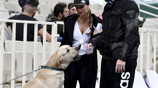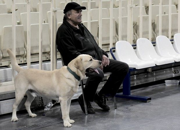 Συγκεκριμένα, πίσω από τη μία μπασκέτα πήρε θέση ο σκύλος του Νίκου Παππά, μια τρομερά συμπαθητική φιγούρα που κέρδισε τα βλέμματα και τις εντυπώσεις στο ΟΑΚΑ.