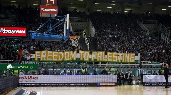 Μεγάλο πανό πίσω από τον πάγκο της Μακάμπι υψώθηκε για λίγα λεπτά στο ΟΑΚΑ, το οποίο έγραφε «Ελευθερία στην Παλαιστίνη».
