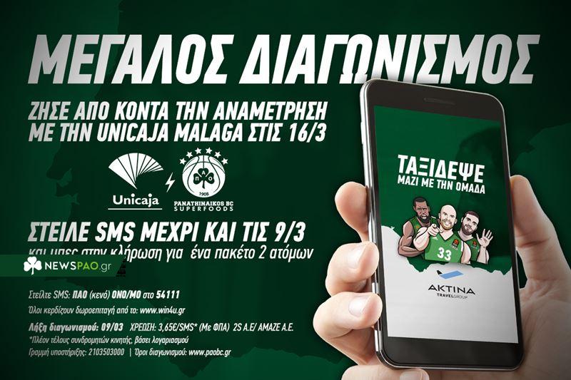 Η ΚΑΕ Παναθηναϊκός Superfoods σας δίνει τη δυνατότητα με ένα μόνο SMS να ζήσετε τη μοναδική εμπειρία να ταξιδέψετε μαζί με τους νταμπλούχους Ελλάδας 2017 στην ιδιωτική πτήση για τη Μάλαγα, να διαμείνετε στο ίδιο ξενοδοχείο με την ομάδα (συμπεριλαμβάνεται και πρωινό), να γνωρίσετε τους αθλητές και το τεχνικό επιτελείο και να παρακολουθήσετε τον σημαντικό αγώνα με την Ουνικάχα Μάλαγα (16/3, 22.00) από τις εξέδρες του «Palacio de Deportes José María Martín Carpena».