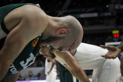 Ο Νικ Καλάθης, ύστερα από αγκωνιά που δέχτηκε στο παιχνίδι με τη Ρεάλ Μαδρίτης, μάτωσε στο κεφάλι του.