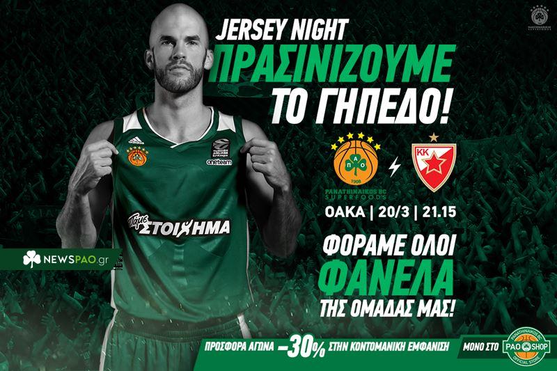 Η ΚΑΕ Παναθηναϊκός Superfoods θεσπίζει από φέτος τη «Jersey Night» και καλεί τους φίλους της να έρθουν στο ΟΑΚΑ φορώντας μπασκετικές φανέλες της ομάδας μας. Είτε τη φετινή, είτε προηγούμενων ετών, είτε με το όνομα ενός αγαπημένου τους παίκτη στην πλάτη, είτε και χωρίς όνομα.