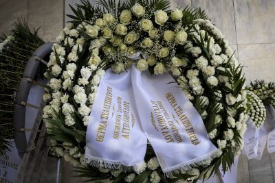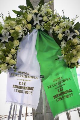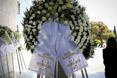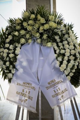 Στεφάνια κατέθεσαν ο Δημήτρης Ιτούδης, οι Γιώργος και Παναγιώτης Αγγελόπουλος, η ΚΑΕ Ολυμπιακός, η ΚΑΕ ΑΕΚ, ο Μάκης Αγγελόπουλος, η Θύρα 13, ο Βαρδής και η Μαριάννα Βαρδινογιάννη και πολλοί ακόμα.