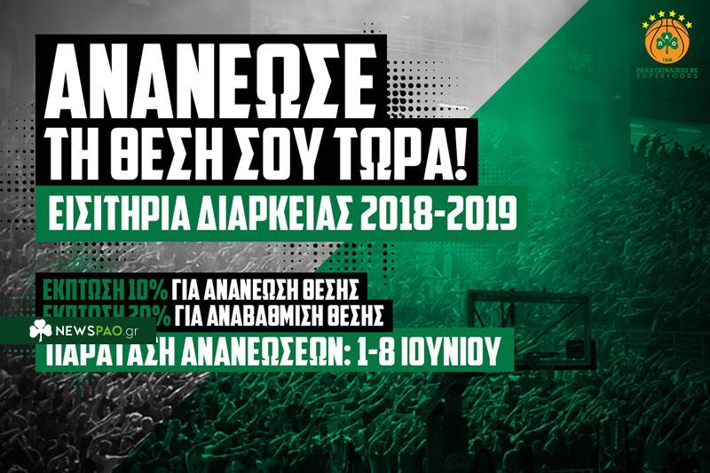 Η ΚΑΕ Παναθηναϊκός Superfoods ενημερώνει τους κατόχους διαρκείας της σεζόν 2017-18 πως, λόγω της μεγάλης ζήτησης που υπάρχει, παρατείνει μέχρι τις 8 Ιουνίου (αρχικά ήταν μέχρι τις 31/5) το διάστημα ανανέωσης ή αναβάθμισης της θέση τους στο ΟΑΚΑ και για την επόμενη αγωνιστική περίοδο (2018-19), επωφελούμενοι έκπτωσης από 10% μέχρι 20% σε όλες τις κατηγορίες αλλά και μοναδικά προνόμια.