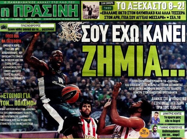 Επίσης, στο εξώφυλλο της «πράσινης» εφημερίδας αναφέρεται: «Στον Ολυμπιακό τρέμουν τη «σκούπα» και επιδίδονται σε μπαράζ αστοχιών δείχνοντας… λίγοι ακόμα μια φορά μπροστά σε τελικούς κόντρα στον παντοτινό πρωταθλητή!»
