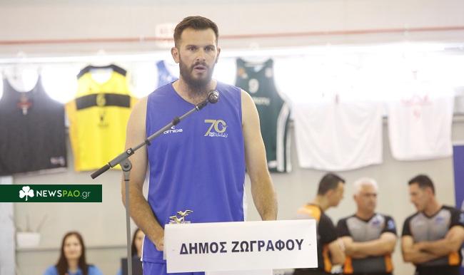 «Ξέρετε ότι δεν είμαι πολύ καλός στα λόγια. Θα ήθελα πάνω απ’ όλα να ευχαριστήσω τον Δήμο Ζωγράφου για τη μεγάλη τιμή που μου κάνει, να ευχαριστήσω όλο τον κόσμο που βρίσκεται εδώ πέρα, παλιούς συμπαίκτες και προπονητές. Γενικά, άτομα που τα γνωρίζω όλη μου τη ζωή. Δεν πιστεύω ότι υπάρχουν λόγια για να περιγράψω τη χαρά μου. Ελπίζω όλο αυτό που γίνεται εδώ πέρα να γίνει ένα μάθημα για όλο τον κόσμο. Ότι από τη στιγμή που τα κατάφερα εγώ να μπει το όνομά μου σ’ αυτό το γήπεδο απλά με μία μπάλα και μία μπασκέτα, φανταστείτε τι μπορεί να κάνει ο καθένας σας αν προσπαθήσει σκληρά γι’ αυτό που θέλει και ζητά».