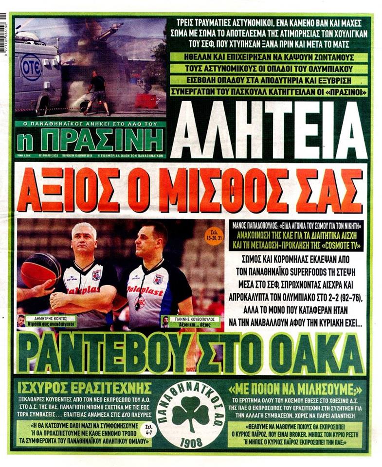 Στην εφημερίδα «Πράσινη» εντοπίζεται ο εξής τίτλος: «Αλητεία! Άξιος ο μισθός σας! Ραντεβού στο ΟΑΚΑ!».