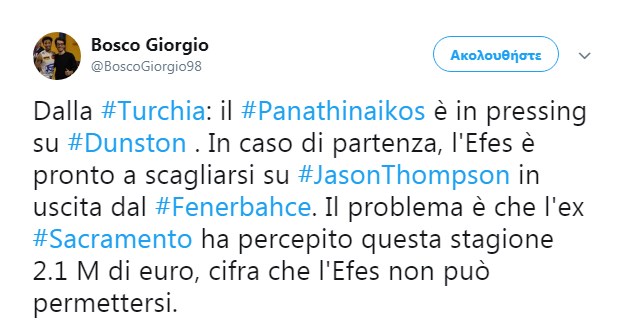 Συγκεκριμένα, έγραψε στο twitter ότι ο Παναθηναϊκός «πιέζει» ασφυκτικά για να ντύσει στα πράσινα τον Ντάνστον.