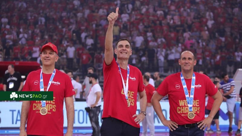 Οι αδελφοί Αγγελόπουλοι πήραν τη θέση τους δίπλα στον Γιώργο Μπαρτζώκα στη συνέντευξη Τύπου του Ολυμπιακού μετά την κατάκτηση του double και ζεσταίνονταν.