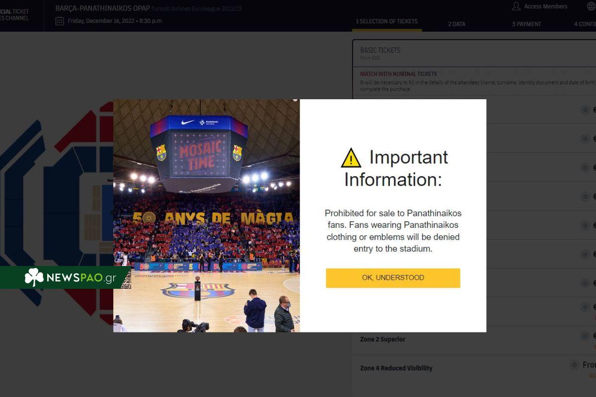 Για την ακρίβεια, αν μπει κάποιος στο επίσημο site της καταλανικής ομάδας και προσπαθήσει να κλείσει εισιτήριο για το ματς θα δει να εμφανίζεται ένα μήνυμα το οποίο αναφέρει: “Απαγορεύεται η πώληση σε οπαδούς του Παναθηναϊκού. Η είσοδος δεν θα επιτρεπεί σε όσους φοράνε ρούχα ή το έμβλημα του Παναθηναϊκού”.