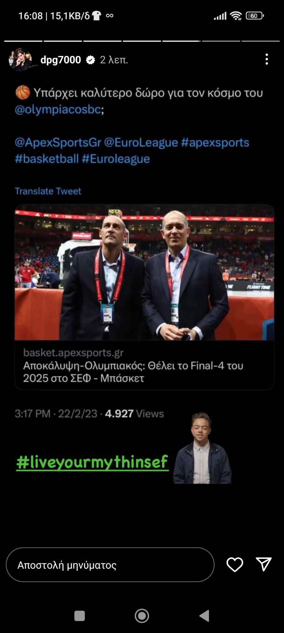 Ο Δημήτρης Γιαννακόπουλος κοινοποίησε δημοσίευμα με το αίτημα που φέρεται να κατέθεσε η ΚΑΕ Ολυμπιακός για Final 4 στο ΣΕΦ.