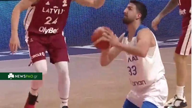 Ο παίκτης του Παναθηναϊκού (δανεικός στο Περιστέρι) βρήκε δύο πόντους γονατιστός στην εκπνοή του χρόνου απέναντι στην Λετονία.