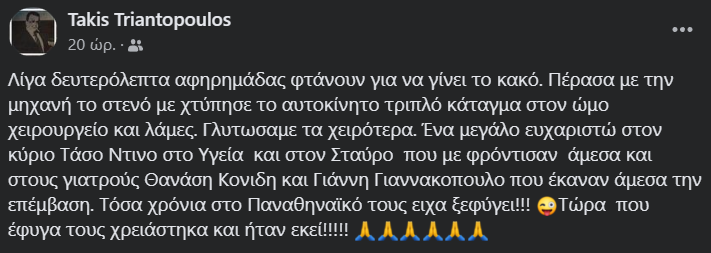 Ο Τάκης Τριαντόπουλος περιέγραψε στον προσωπικό του λογαριασμό του στο Facebook την περιπέτεια που πέρασε.