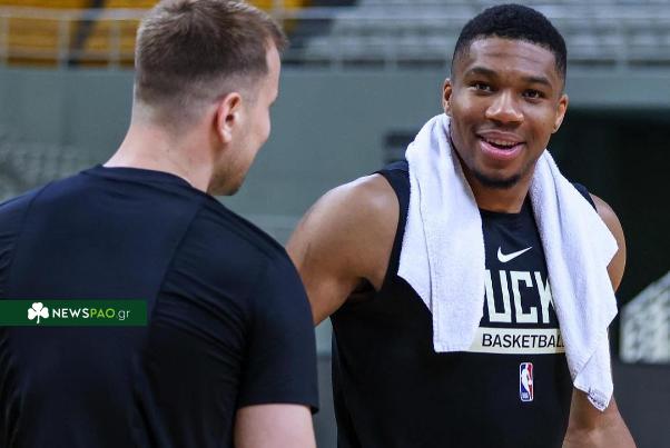 Ο κορυφαίος παίκτης του NBA βρέθηκε την Τετάρτη στο ΟΑΚΑ για την προπόνηση του Παναθηναϊκού και είχε την ευκαιρία να συνομιλήσει για λίγα λεπτά με τον συμπαίκτη του στην Εθνική, Δημήτρη Αγραβάνη.