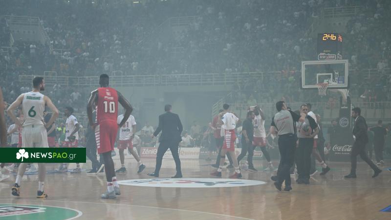 Στο 27ο λεπτό της αναμέτρησης με το σκορ στο 35-63 το παιχνίδι διακόπηκε για ρίψη καπνογόνων , η αποστολή του Ολυμπιακού έφυγε απευθείας για τα αποδυτήρια και οι τύχες του αγώνα είναι κυριολεκτικά στον «αέρα».