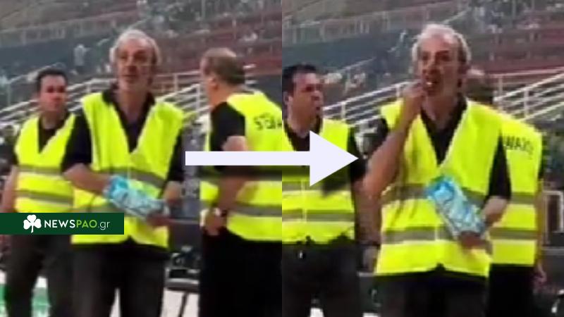 Κατά τη διάρκεια της διακοπής του ντέρμπι … ένας σεκιουριτάς δεν κρατήθηκε από τη λιγούρα και αποφάσισε να φάει πατατάκια παρακολουθώντας τις… εξελίξεις περιμετρικά του παρκέ.