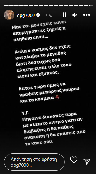 «Μιας και μου έχεις κάνει απερίγραπτες ζημιές η αλήθεια είναι… Απλά ο κόσμος δεν έχει καταλάβει το μέγεθος, διότι δυστυχώς όσο αλήτης είσαι αλλά τόσο είσαι και έξυπνος.