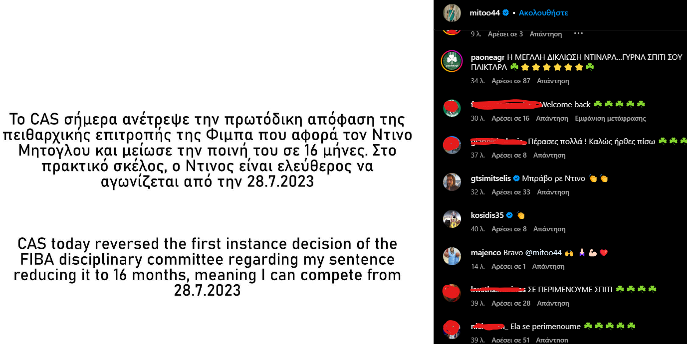 «Το CAS σήμερα ανέτρεψε την πρωτόδικη απόφαση της πειθαρχικής επιτροπής της FIBA που αφορά τον Ντίνο Μήτογλου και μείωσε την ποινή του σε 16 μήνες. Στο πρακτικό σκέλος, ο Ντίνος είναι ελεύθερος να αγωνίζεται από την 28.7.2023.»