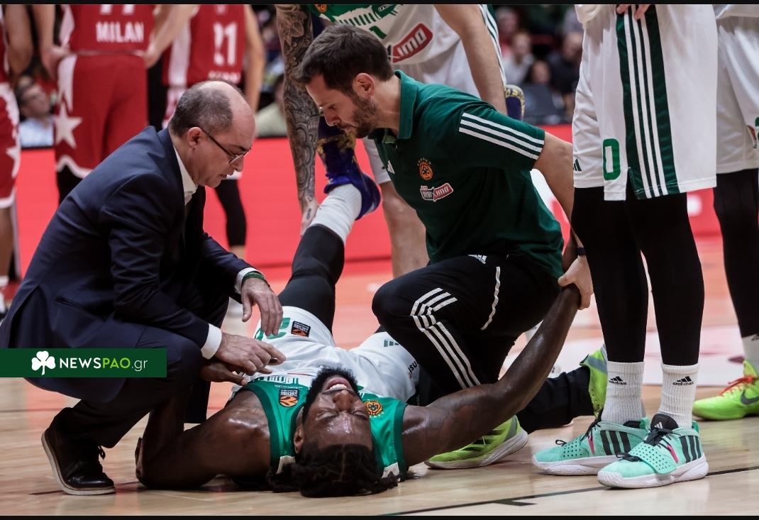 Ο σέντερ του Παναθηναϊκού, περίπου 3:30 λεπτά πριν το τέλος της αναμέτρησης, έπεσε πολύ άτσαλα πάνω στο παρκέ και από μεγάλο ύψος με αποτέλεσμα να σφαδάζει από τους πόνους και να κατευθυνθεί εκτός υποβασταζόμενος. Όπως είναι λογικό άπαντες έχασαν το… χρώμα τους, βλέποντας τον να μην μπορεί να περπατήσει κανονικά, αλλά και να μη μπορεί να συνεχίσει στον αγώνα.