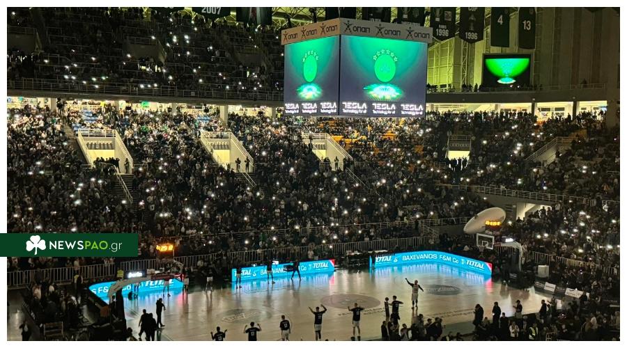 Οι φίλοι του Παναθηναϊκού έχουν δημιουργήσει μια τρομερή ατμόσφαιρα στο ΟΑΚΑ ενώ την παράσταση για άλλη μια φορά κλέβει η εντυπωσιακή είσοδος των παικτών του Εξάστερου στο παρκέ.