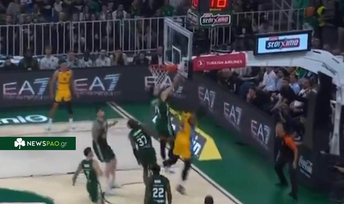 Ο σμολ φόργουορντ του Παναθηναϊκού μοίρασε μια απίθανη τάπα σε εντυπωσιακό άλμα και προστάτεψε τη ρακέτα του Τριφυλλιού.