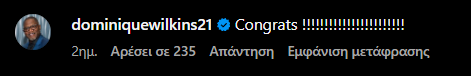 Ο Ντομινίκ Ουίλκινς συνεχάρη τον Παναθηναϊκό για την κατάκτηση της Ευρωλίγκα.