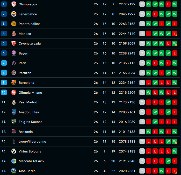 Η 26η αγωνιστική της Euroleague ολοκληρώθηκε με τον Παναθηναϊκό να έχει θετικά αποτελέσματα για εκείνον και στο τέλος της ημέρας να ανεβαίνει στην 3η θέση της κατάταξης έχοντας ρεκόρ 16-10.