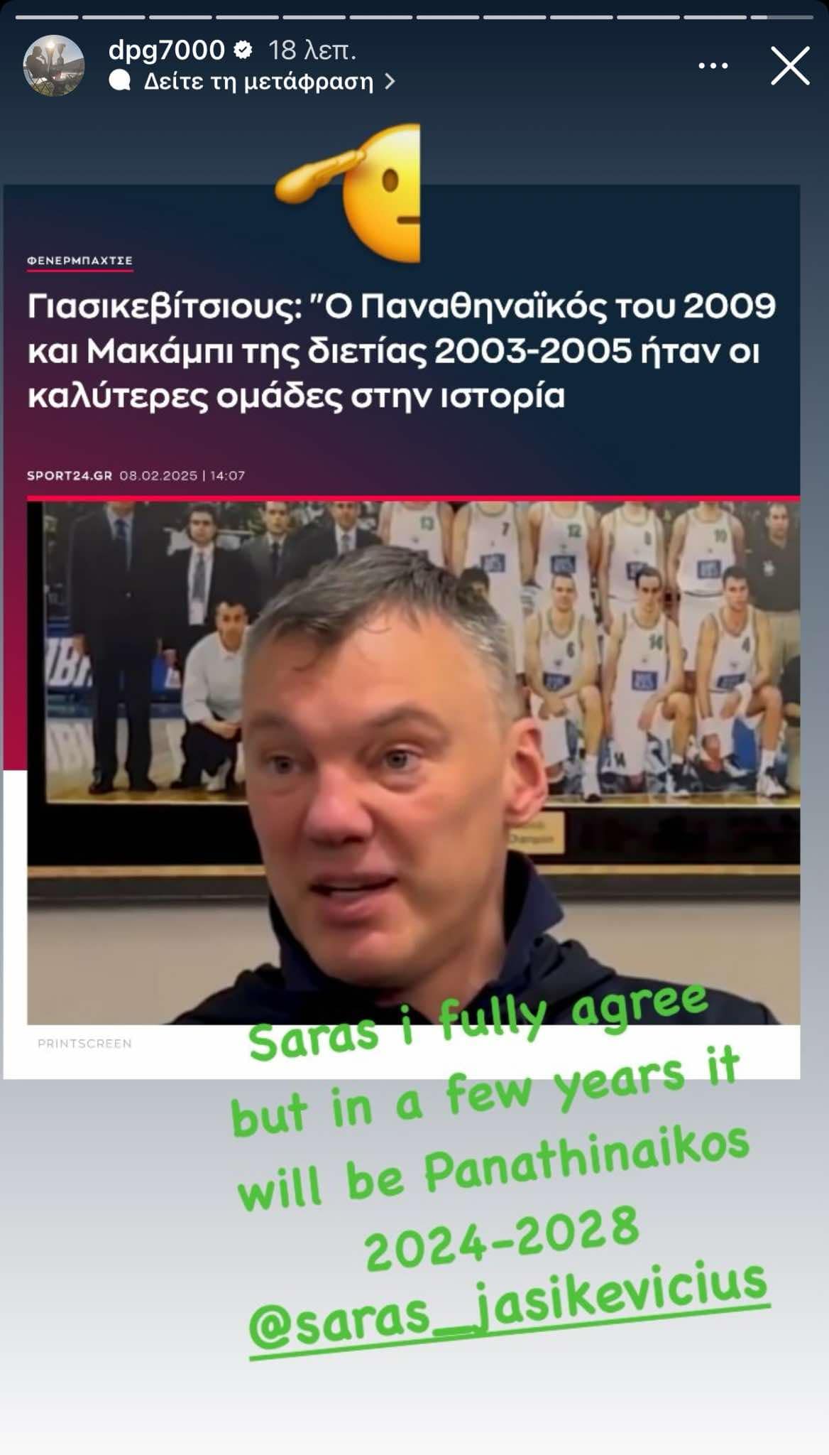 Ο DPG ανέβασε τη συγκεκριμένη δήλωση στο Instagram και συμπλήρωσε: «Σάρας, συμφωνώ απόλυτα, αλλά σε λίγα χρόνια θα είναι ο Παναθηναϊκός του 2024-2028».