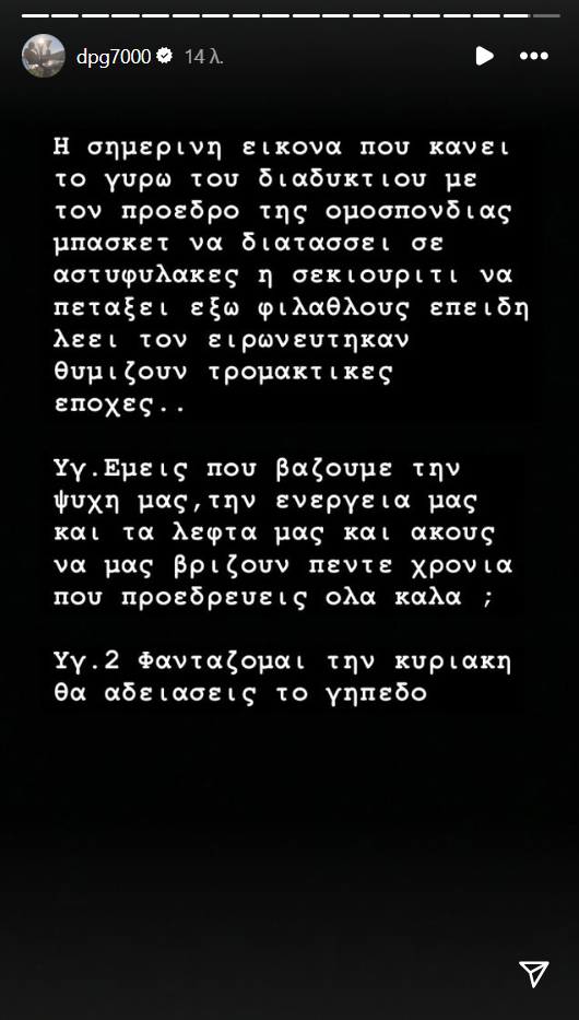 Η σημερινη εικονα που κανει το γυρω του διαδυκτιου με τον προεδρο της ομοσπονδίας μπασκετ να διατασσει σε αστυφυλακες η σεκιουριτι να πεταξει εξω φιλαθλους επειδη λεει τον ειρωνευτηκαν θυμιζουν τρομακτικες εποχες..
