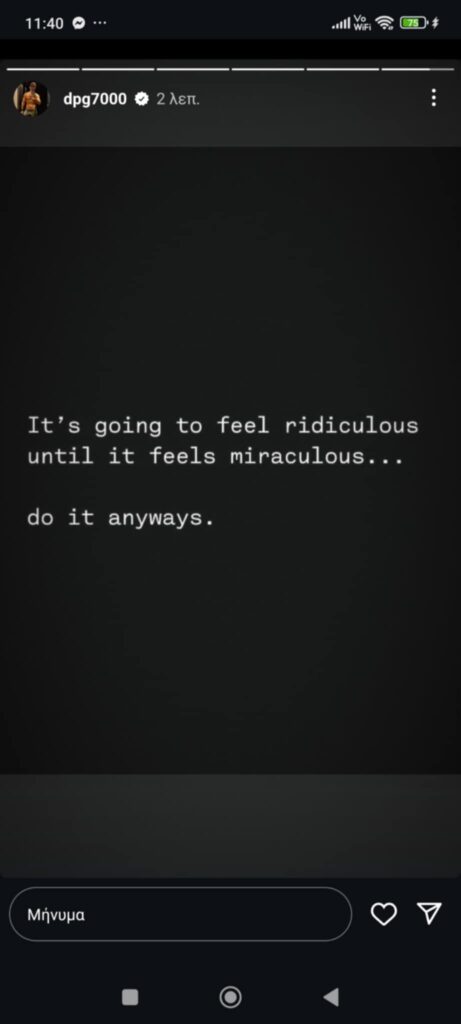 Πιο αναλυτικά ο ισχυρός άνδρας της ΚΑΕ Παναθηναϊκός ανέβασε μια εικόνα ως story, το οποίο γράφει: «Θα αισθάνεται γελοίο μέχρι να νιώσει θαυματουργό. Κάνε το πάντως».