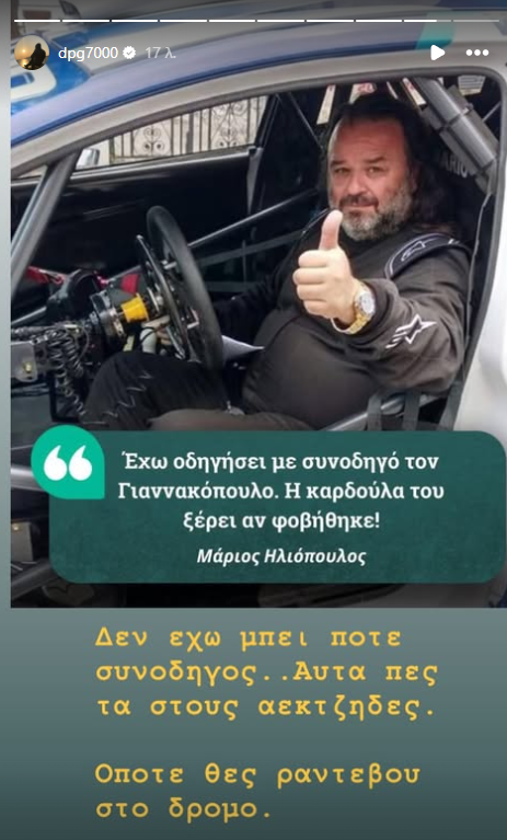 Στη συνέχεια, ο «DPG» ανέβασε και βίντεο στο γνωστό μέσο κοινωνικής δικτύωσης: «Συνοδηγός δεν έχω μπει ποτέ, ποτέ δεν έχω μπει σε σένα. Μια φορά πριν από 15 χρόνια πήγαμε Αθήνα-Λάρισα και, ναι, με πέρασες. Με SL 500 εσύ, με SL 350 εγώ.