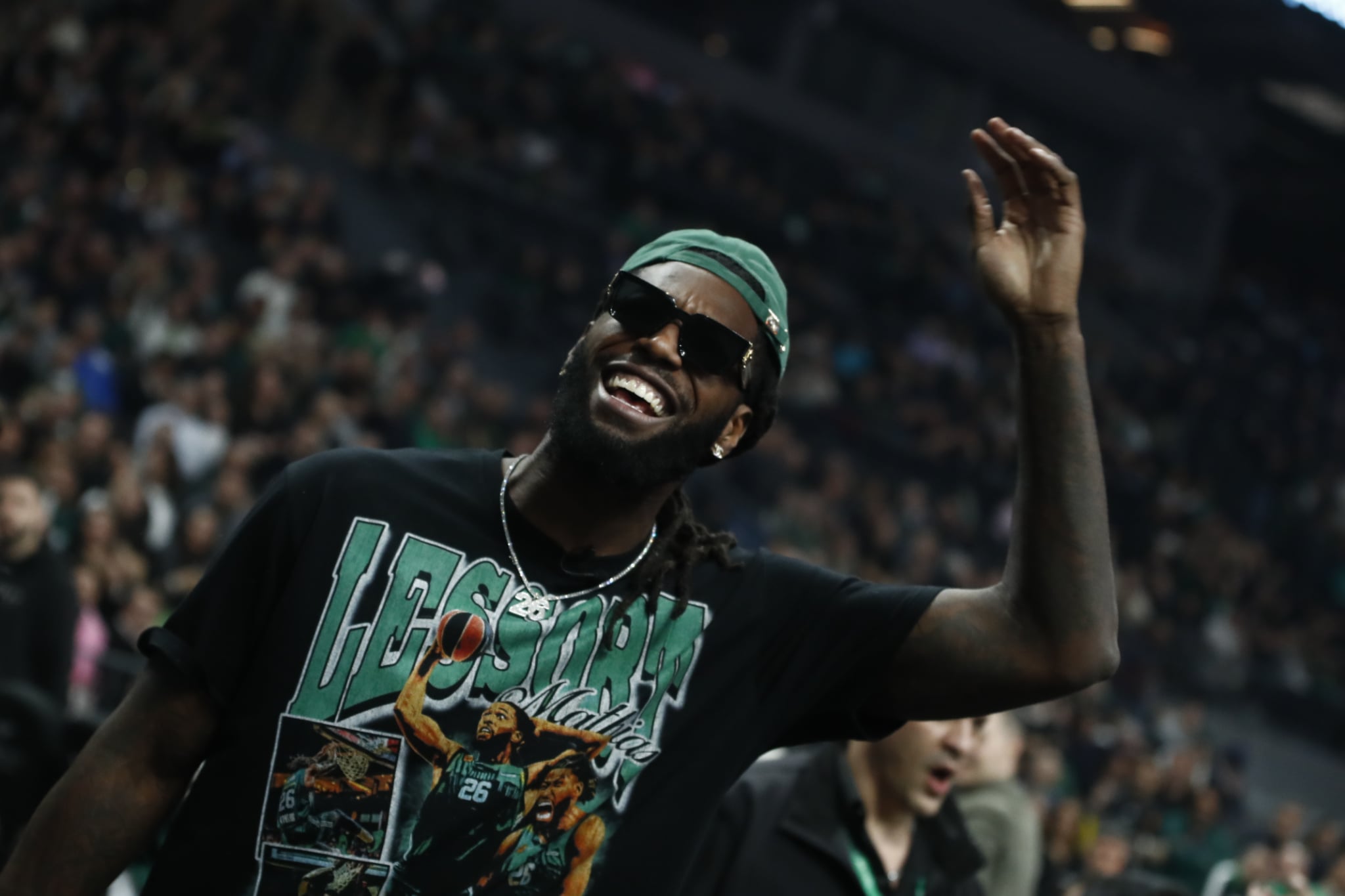 Ο Γάλλος σέντερ απολαμβάνει το παιχνίδι Παναθηναϊκός-Ερυθρός Αστέρας με ένα εντυπωσιακό γυαλί ηλίου, μια αλυσίδα λαιμού και ένα t-shirt «όλα τα λεφτά» με παλιά καρφώματα.