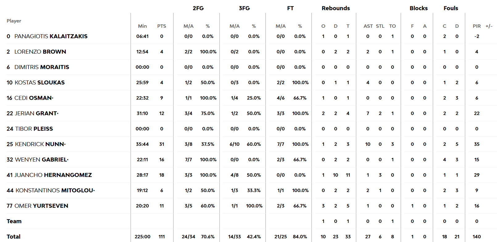 Παναγιώτης Καλαϊτζάκης (5/10): Αγωνίστηκε για 6:41 με ξεκάθαρα αμυντικό ρόλο. Σημείωσε ένα κλέψιμο και ένα επιθετικό ριμπάουντ.