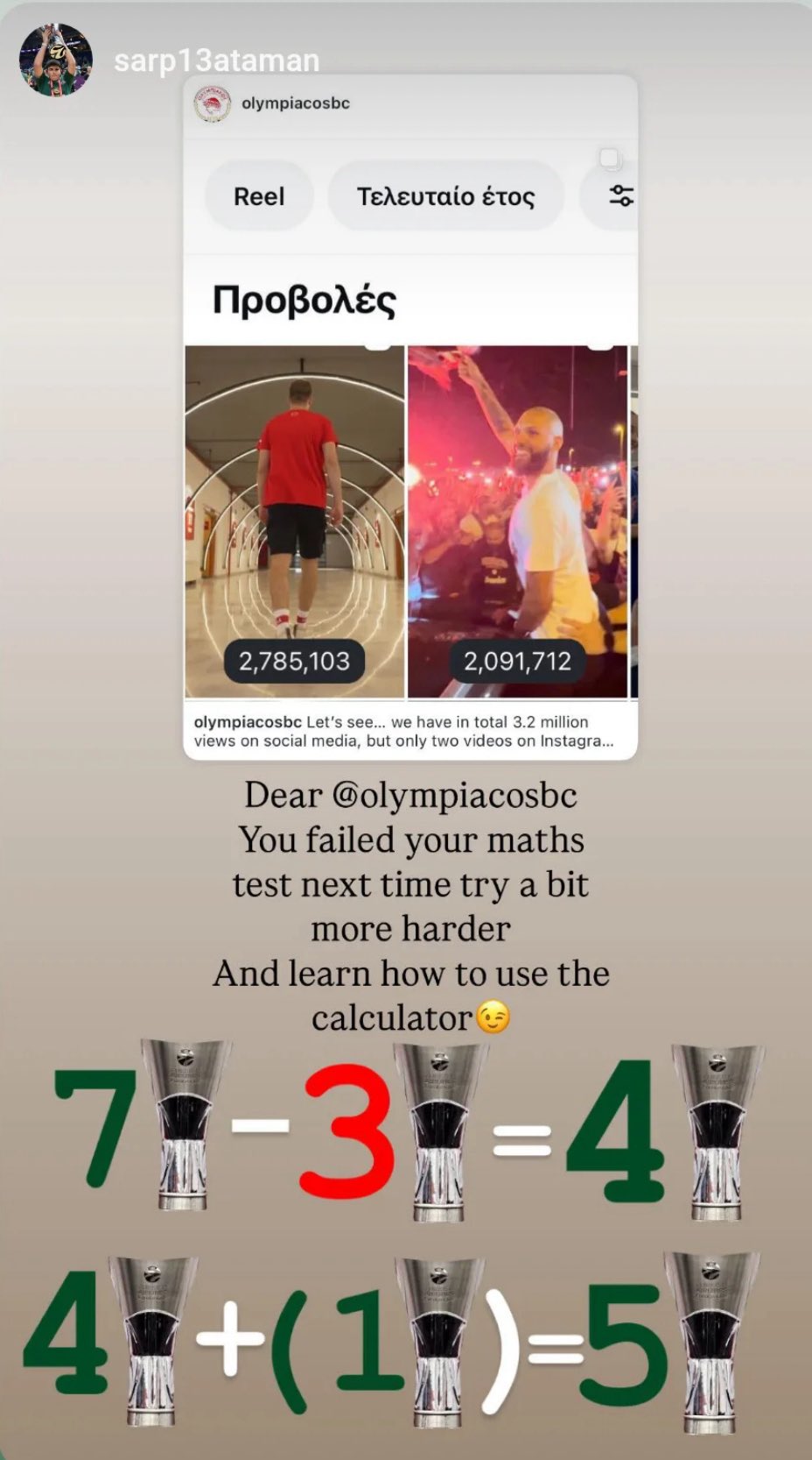 Συγκεκριμένα, ο γιος του Εργκίν Αταμάν έγραψε: «7-3=4 (σ.σ η διαφορά των ευρωπαϊκών ΠΑΟ-ΟΣΦΠ), 4+1=5 (σ.σ η τωρινή διαφορά, συν το ευρωπαϊκό που θα σηκώσει το Τριφύλλι στο Άμπου Ντάμπι).