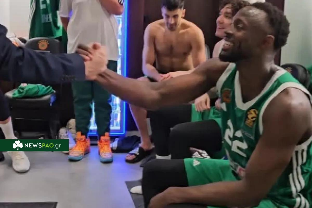 Η ΚΑΕ Παναθηναϊκός έδωσε στη δημοσιότητα ένα βίντεο από τα αποδυτήρια, στο οποίο ο Γκραντ δέχεται θερμά συγχαρητήρια για το κρίσιμο τρίποντο που πέτυχε.