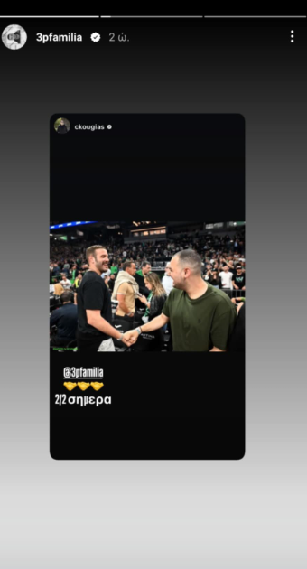 Λίγες ώρες πριν το Game 2, εκείνος έκανε ανάρτηση στα κοινωνικά δίκτυα, στην οποία εμφανίζεται μαζί με τον Νίκο Παππά. «2/2 σήμερα», συμπλήρωσε στη σχετικό story.