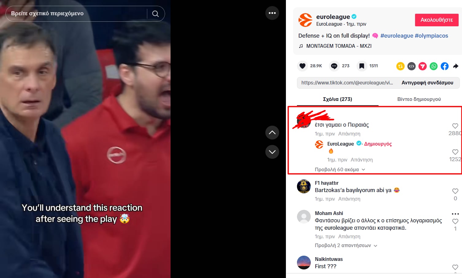Ούτε τα… προσχήματα δεν κρατούν στην Ευρωλίγκα με τη διοργανώτρια αρχή να απαντά με «φωτιά» σε μήνυμα οπαδού του Ολυμπιακού στο Tik Tok «έτσι γ@μ@ει ο Πειραιάς».