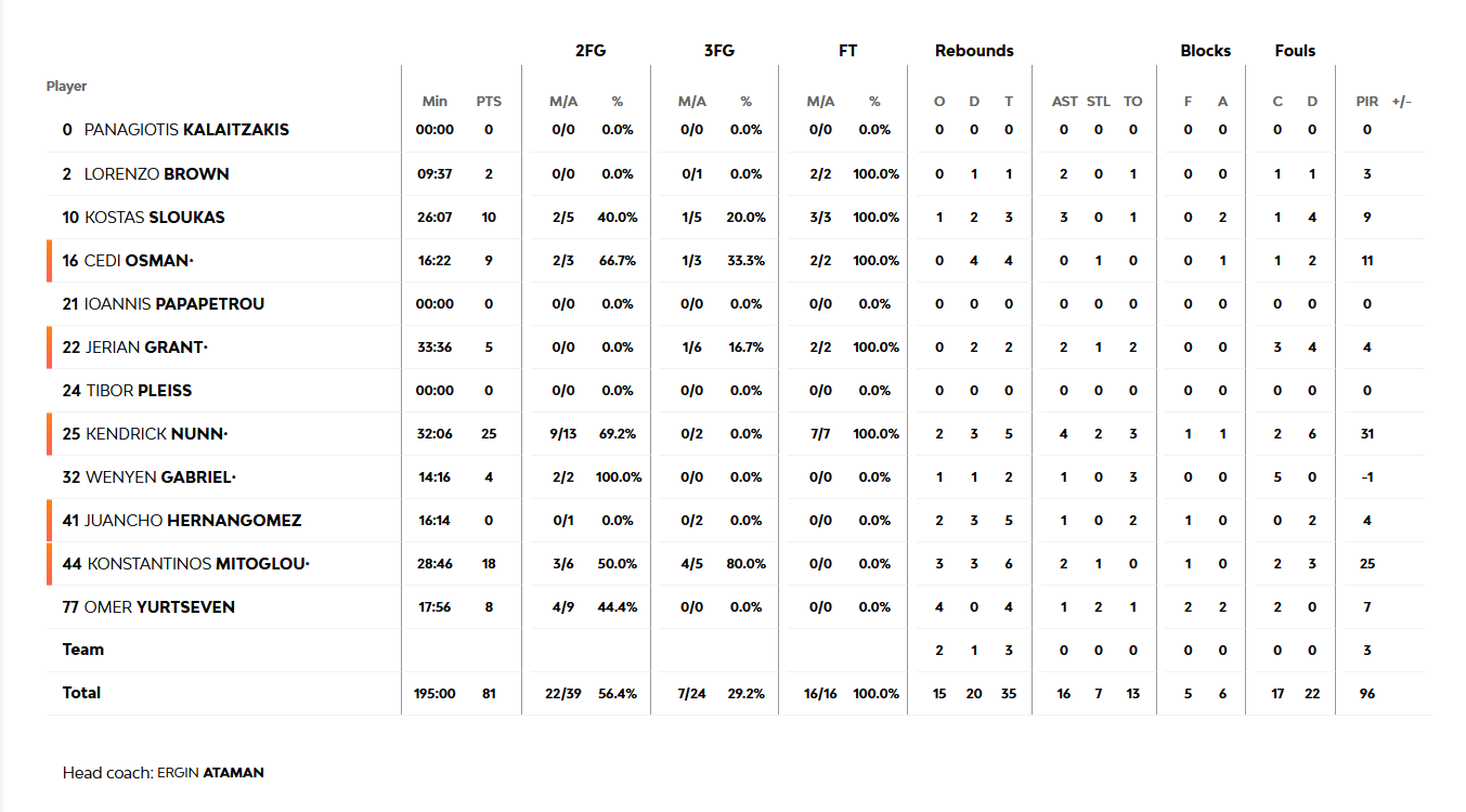 Κώστας Σλούκας (7/10): Ο «αρχηγός» ευστόχησε στις κρίσιμες βολές σε ένα φάουλ που κέρδισε ο Χουάντσο. Σούταρε με 20% στο τρίποντο (1/5). Σημείωσε 10 πόντους, 3 ασίστ και 3 ριμπάουντ.