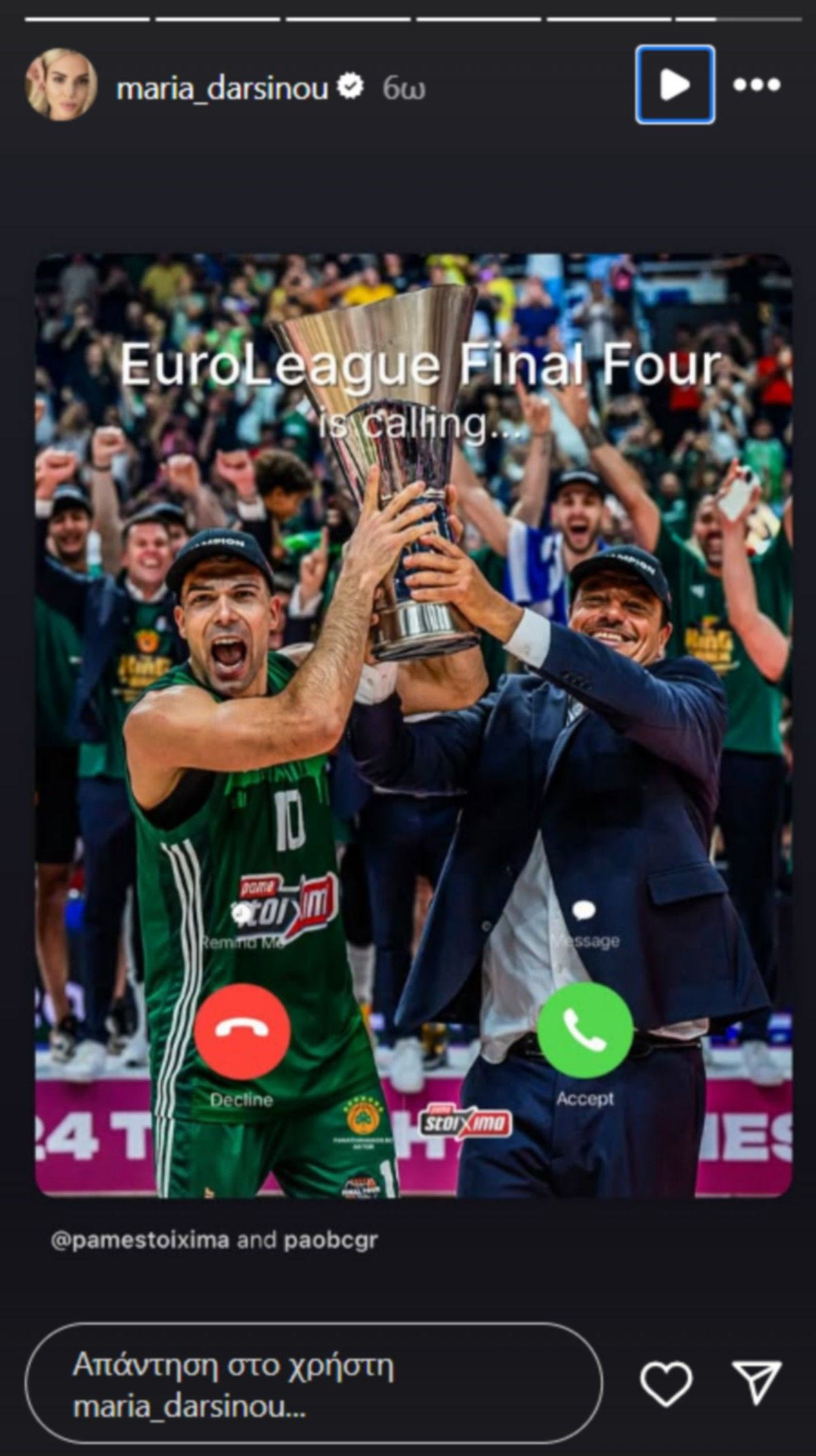 Συγκεκριμένα, ανάρτησε ένα insta story που έκλεψε την παράσταση: μια επεξεργασμένη εικόνα στην οποία εμφανίζεται μια εισερχόμενη κλήση από το “EuroLeague Final Four”. Στην εικόνα απεικονίζονται τόσο ο Κώστας Σλούκας όσο και ο Εργκίν Αταμάν, να πανηγυρίζουν χαμογελαστοί κρατώντας το τρόπαιο της EuroLeague, στέλνοντας έτσι ένα σαφές και αισιόδοξο μήνυμα για την πορεία της ομάδας.