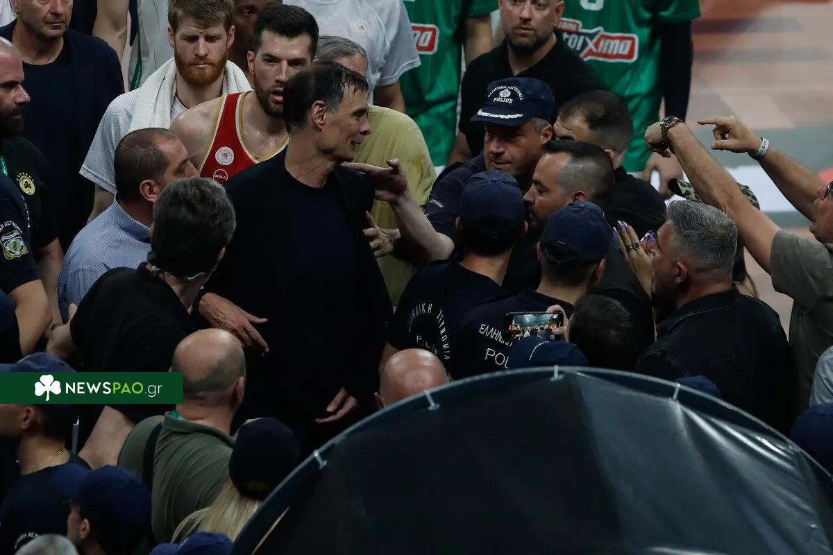 Στο τέλος του αγώνα και ακριβώς στο ίδιο σημείο, αντικείμενο εκσφενδονίστηκε προς το μέρος του προπονητή του Ολυμπιακού.