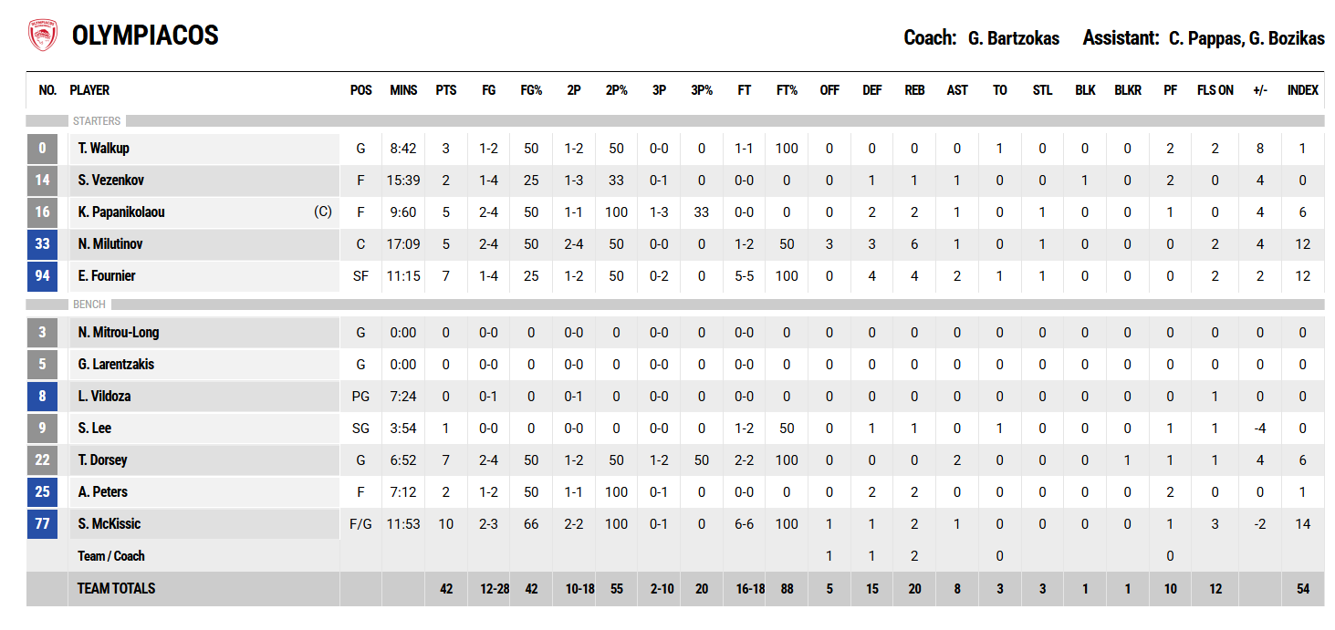 Στο ημίχρονο, ο Ολυμιακός έχει σουτάρει 18 ελεύθερες βολές.