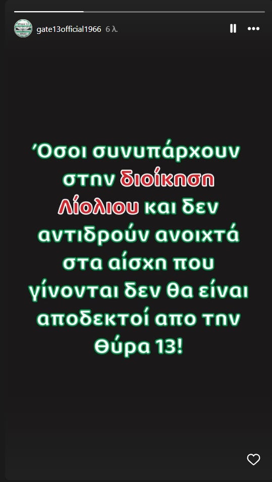 «Όσοι συνυπάρχουν στη διοίκηση Λιόλιου και δεν αντιδρούν ανοιχτά στα αίσχη που γίνονται, δεν θα είναι αποδεκτοί από τη Θύρα 13»