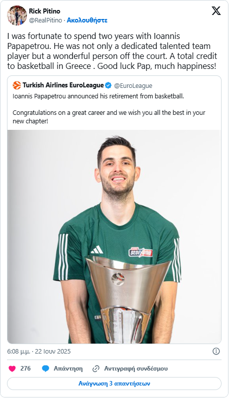 Ο Παπαπέτρου, που πρόσφατα γνωστοποίησε την αποχώρησή του από το επαγγελματικό μπάσκετ μέσα από ένα συγκινητικό μήνυμα στο Instagram, συγκίνησε και τον Ρικ Πιτίνο, ο οποίος έγραψε χαρακτηριστικά: