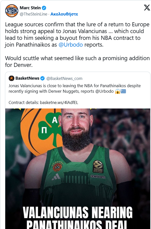 «Πηγές της Λίγκας επιβεβαιώνουν ότι το δέλεαρ μιας επιστροφής στην Ευρώπη ασκεί ισχυρή έλξη στον Γιόνας Βαλαντσιούνας!