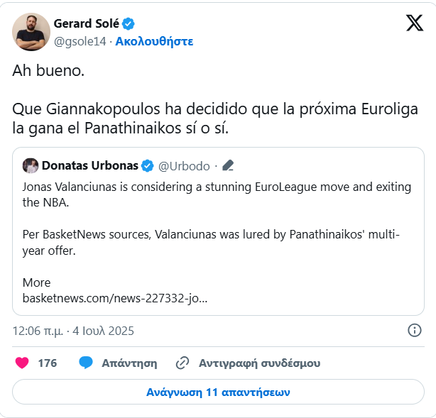«Α ωραία. Ο Γιαννακόπουλος έχει αποφασίσει ότι ο Παναθηναϊκός θα κερδίσει την επόμενη Ευρωλίγκα ό,τι και να γίνει», έγραψε χαρακτηριστικά ο Σολέ, κοινοποιώντας την είδηση της επικείμενης μεταγραφής του Βαλαντσιούνας στο «τριφύλλι».