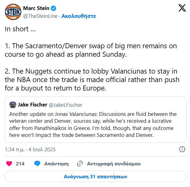 Όπως σημειώνει χαρακτηριστικά ο Στάιν: «Η ανταλλαγή ψηλών μεταξύ Σακραμέντο και Ντένβερ παραμένει σε καλό δρόμο για να προχωρήσει όπως είχε προγραμματιστεί την Κυριακή. Οι Νάγκετς συνεχίζουν να πιέζουν τον Βαλαντσιούνας να παραμείνει στο ΝΒΑ μόλις επισημοποιηθεί η ανταλλαγή και όχι να πιέσει για εξαγορά για να επιστρέψει στην Ευρώπη».