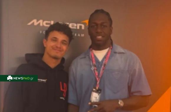 Ο Αμερικανός σταρ του Παναθηναϊκού τίμησε το μηχανοκίνητο αθλητισμό και πόζαρε χαμογελαστός με τον οδηγό της McLaren, Λάντο Νόρις.