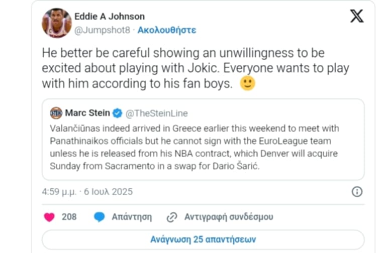 Μέσα σε αυτό το κλίμα, ο παλαίμαχος ΝΒΑερ και πρώην παίκτης του Ολυμπιακού, Έντι Τζόνσον, αποφάσισε να παρέμβει δημόσια στην κουβέντα. Αφορμή στάθηκε ένα tweet του Στάιν για το ενδεχόμενο μετακόμισης του Βαλαντσιούνας στην Αθήνα, με τον Τζόνσον να σχολιάζει αιχμηρά την απροθυμία του Λιθουανού να συνεχίσει στους Νάγκετς, λέγοντας: