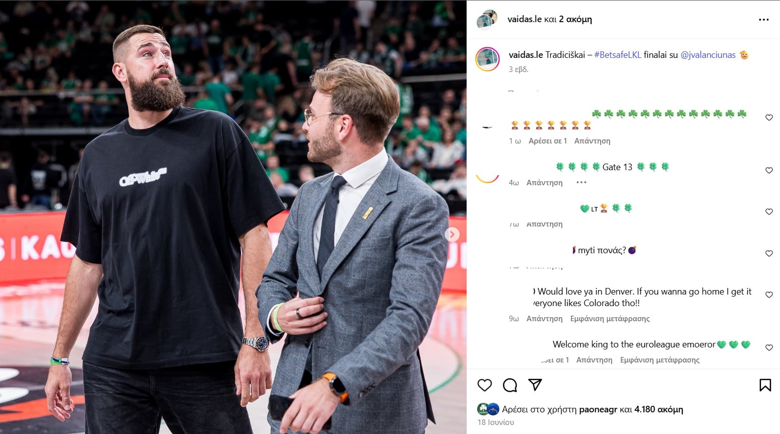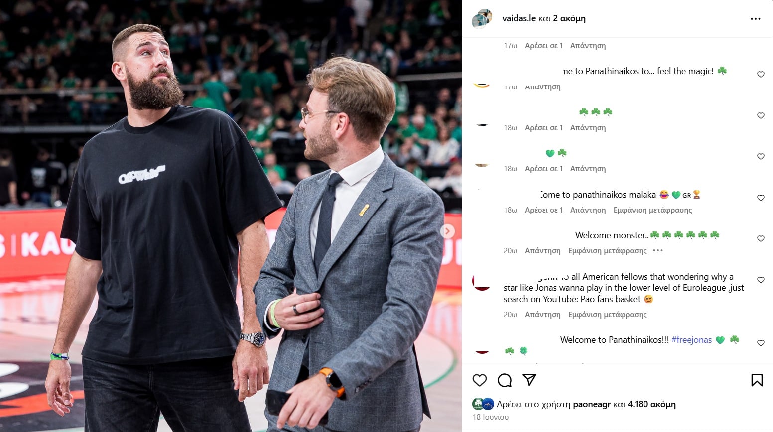 Ο λογαριασμός του Γιόνας Βαλαντσιούνας στο Instagram έχει κατακλυστεί από… πράσινο χρώμα, με τους φίλους του Παναθηναϊκού να δίνουν το δικό τους μήνυμα στήριξης στον Λιθουανό σέντερ.